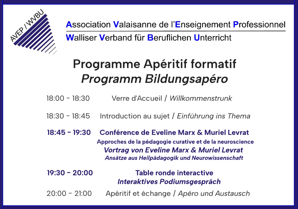 Eveline Marx, pédagogue spécialisée, présentera les conclusions de son mémoire de master sur la compensation des désavantages au niveau secondaire II en Valais, tandis que Muriel Levrat nous fera part de ses réflexions d’un point de vue neuroscientifique.